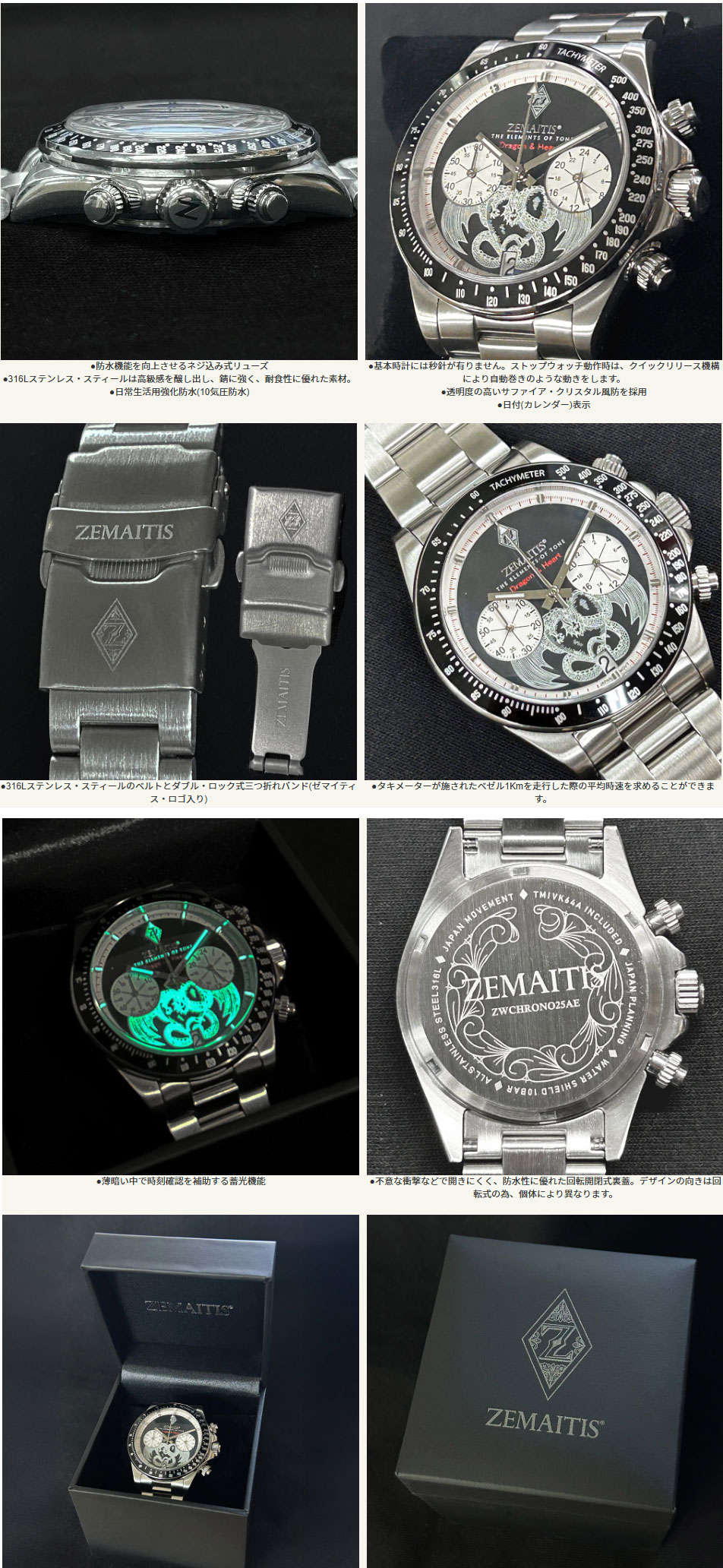 ゼマイティス・ギターを象徴するメタル・フロントのデザインを投入し、エレガントな雰囲気とゼマイティスらしい気品さを併せ持つ高級腕時計「ZWCHRONO25DH」が登場しました。第四弾となる今回はストップウォッチ機構を搭載した(クロノグラフ)モデルになります。