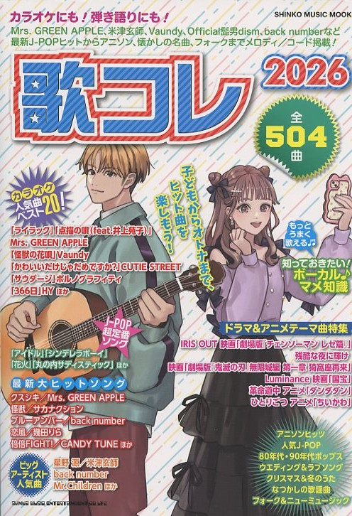 コスパ最高で人気の歌本「歌コレ」!「IRIS OUT」「クスシキ」「かわいいだけじゃだめですか?」など、2025年度に沢山歌われたヒット曲はもちろん、米津玄師、Official髭男dism、Mrs. GREEN APPLE、星野 源、あいみょん、back number、ミスチル、サザンなどJ-POPヒット、アニソン、歌謡曲からフォークの定番まで盛りだくさんの歌のコレクション★ 超お得な歌本です。