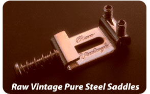 リイシューサドルの硬度は部位によりバラツキがあり、ヴィンテージの物とは性質が異なります。更にメッキの美しさを優先するために銅を下地に塗る事が多く、音に大きな影響を与えています。Raw Vintage Pure Steel Saddleは、現在得られる中で最もヴィンテージに近い素材を使用することで硬度のバラツキを解消し、ニッケルメッキを直に施してよりヴィンテージのサドルに近づけました。もちろん現行品リイシューギター等にリプレイスメント・パーツとしても使用が可能で、ヴィンテージを所有しない方も、より本物に近いその性能を堪能出来ることでしょう。