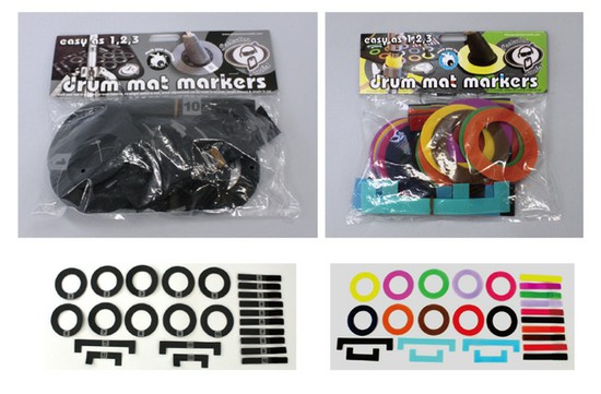 スタンド10本及びハイハットとキックの位置をマットにマークできます。 着脱自在なマジックテープ付。カラーバージョンはツインペダルにも対応します。