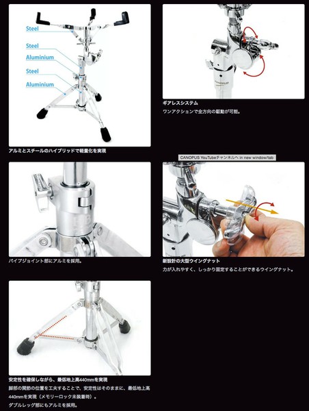 屈強さと軽さの共存がコンセプトのハイブリッドハードウェアシリーズのスネアスタンド。スチール+アルミのハイブリッド構造、ワンアクションで全方向の駆動が可能なギアレスシステムなどを搭載したスネアスタンドです。