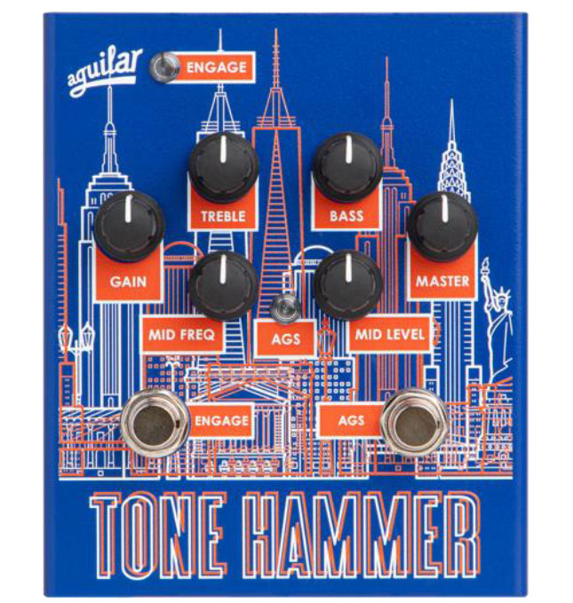 aguilar の定番プリアンプ「tone hammer」から、洗練されたニューヨークのスカイラインが外装にあしらわれた限定モデルが登場。TONE HAMMER はその名の通り強力なプリ・アンプ/D.I.回路をストンプ・ボックスの形にまとめた商品です。すでに高い評価を得ている OBP-3 プリ・アンプの回路を採用し、更に Adaptive Gain Shaping circuitry (AGS)を採用することにより必要な Gain と EQ を必要なときにフット・スイッチ一つで呼び出すことが可能です。モダンなスラップ・ベースからビンテージ、又はオーバードライブ・サウンドまで好みの味付けが可能です。18V 駆動により常識を超えたヘッド・ルームを確保し、Gain と Masterを独立させることで必要な歪を得ることができます