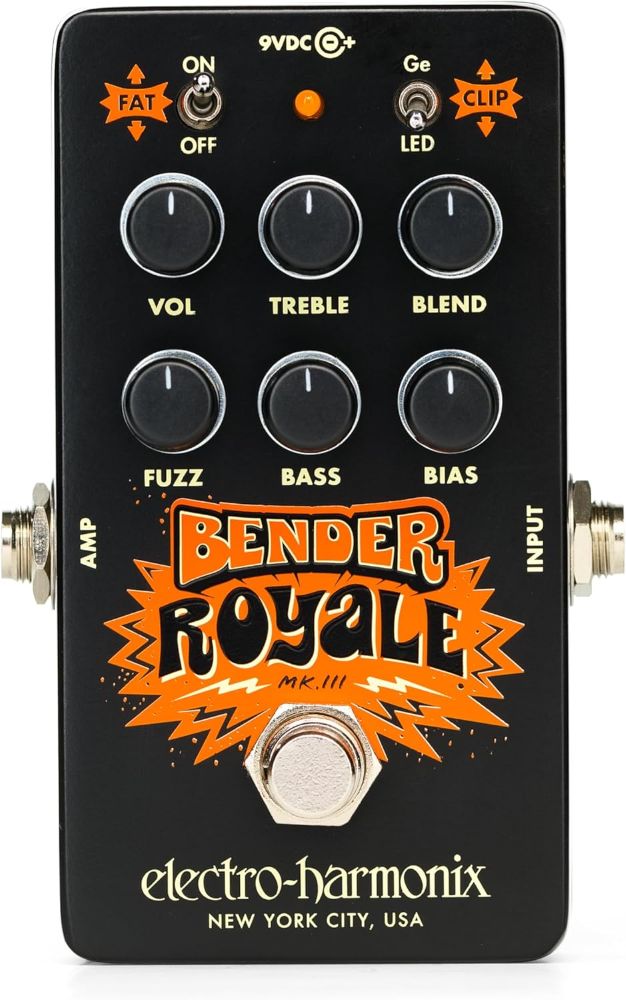 3トランジスタ・ファズの歴史は、数々のメーカーと数々の派生によって彩られ、物語も色彩も豊かです。EHXは、Bender Royaleファズでその歴史に新たな一章を刻みます!ビンテージ・ゲルマニウム・ベース回路のMkIIIバージョンを踏襲したBender Royaleは、オリジナルの見事なサチュレーション・サウンドを受け継ぎ、厚みのある滑らかなサウンドから、荒々しくパチパチとしたサウンドまで、幅広いファズ・トーンの世界を切り開きます。荒々しくパワフルなファズ、あるいは力強くサチュレーションの効いたサウンドがお好みなら、Bender Royaleがきっと満足できるでしょう。オリジナルの3ノブ・コントロールセットは、VOL、FUZZ、BASSノブに搭載されています。VOLは出力をコントロールし、FUZZは入力ゲインを調整し、BASSはパッシブ・ベースとして動作し、フル・ウールからタイトなベース・レスポンスまで変化します。これらのコントロールにより、力強いリズム・トーンから力強いリード・サウンドまで、非常に汎用性の高いペダルとなっています。