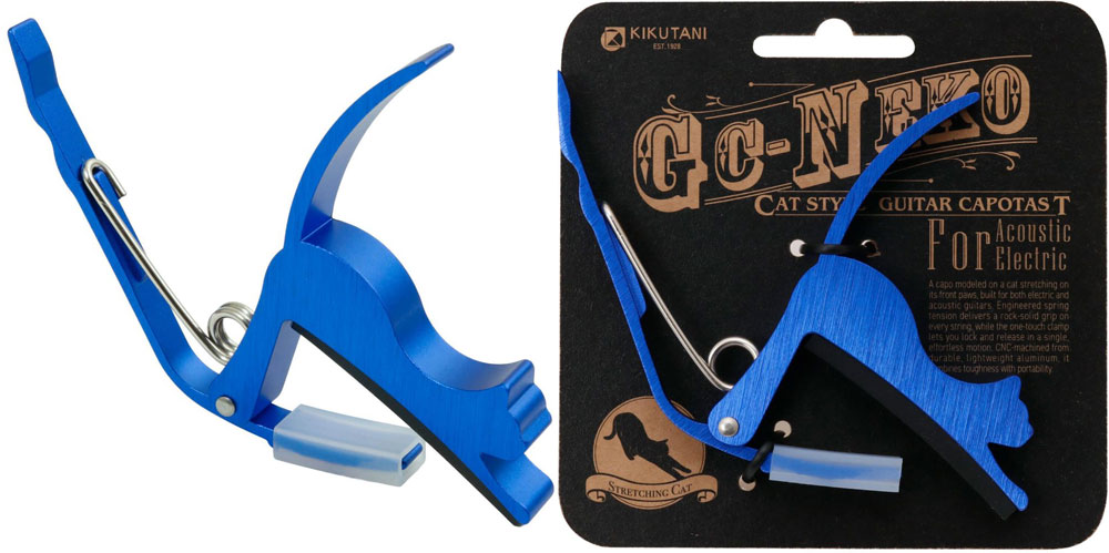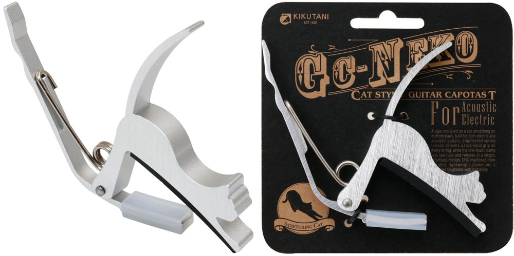 猫が伸びをしているポーズをモチーフとしたギターカポタストです。凛とした存在感の繊細なヘアライン仕上げが生み出す陰影によって、ひと目で「佇まいのクオリティ」を感じさせます。エレキ/ アコースティックを問わず、全弦を均一にホールドする独自スプリングと片手で瞬時に装着・解除できるワンタッチクランプ機構、軽量かつ堅牢なアルミボディの高い機能性はそのままに、研ぎ澄まされたヘアライン仕上げは、ステージライトの下でも写真映えする映像的な美しさを放ち、手に取るたびに演奏への高揚感を呼び起こします。パッケージはレトロアメリカンなテイストを取り入れたモノトーンデザインで、ギフトにも最適です。製品サイズ 121x88x13mm
