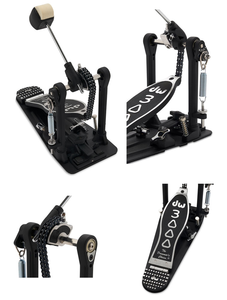DWCP3000Aは、耐久性に優れたオールメタル構造を採用したシングルキックペダルです。デュアルチェーンのアクセラレータードライブにより、踏み込みに応じてスピードとパワーが増し、滑らかで反応の良い演奏感を実現します。フットボード角度やスプリングテンションの調整が可能で、好みに合わせたセッティングが可能。さらに、フェルトとプラスチックの打面を切り替えられる2ウェイビーターを搭載し、多彩な音色に対応します。安定性を高める滑り止め付きベースプレートも備え、ライブから練習まで幅広く活躍するモデルです。