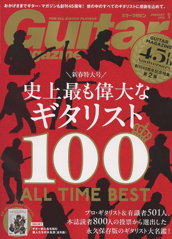 1980年12月号の創刊以来、ギター・マガジンもめでたく45周年を迎えることができました。その間、ロック、ブルース、ジャズ、メタル、フュージョンなど、ジャンルと国籍の垣根を超えた古今東西のギタリストたちを紹介してきましたが、2025年12月現在に最も影響力のある"偉大なギター弾き"とは誰なのでしょうか? プロ・ギタリスト&本誌ライター陣を含む有識者501名、本誌読者800名に協力いただき、勝手ながら2025-2026年版の"偉大なギタリスト100"を選出いたしました。2010年の30周年記念号でも同テーマのアンケート企画を行ないましたが、この15年間にも常識を覆す革新的ギタリストが次々と登場しています。何を持って偉大とするか? そもそもギタリストや音楽に順位をつけるな!という声も頂戴しますが、この先100年、200年と未来永劫続くであろうギター史の1ページとして、本特集をお楽しみいただけますと幸いです。世の中のすべてのギタリストに感謝を込めて。