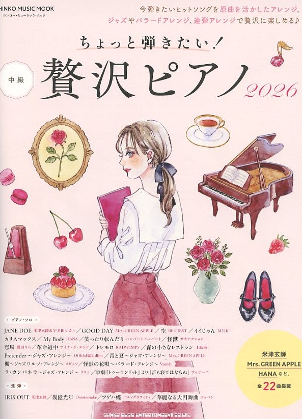 「JANE DOE」「イイじゃん」「青と夏~ジャズ・アレンジ~」「楓~ジャズワルツ・アレンジ~」など、人気のJ-POPや定番のクラシックを中級ピアノ・ソロ&特殊アレンジのピアノ・ソロにて掲載しています。