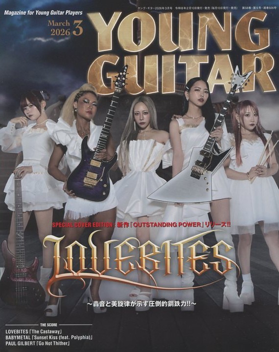 表紙・巻頭特集はLOVEBITES。最新作『OUTSTANDING POWER』を発表する5人のインタビュー、デビューEPからの歩みを記した音源&映像作品を総覧するディスコグラフィ、Midori&Miyakoのギター・チームが映像で解説するメイン機材紹介、2人への奏法取材を元に採譜された「The Castaway」のギター・スコア掲載など、約70ページに及ぶ充実の内容でお届けします!さらに、BABYMETALのワールド・ツアー日本凱旋公演を徹底レポート。“ギターの神”使用機材、ギター・スコア「Sunset Kiss (feat. Polyphia)」も掲載!