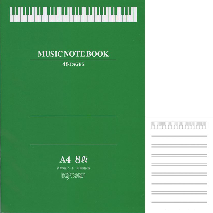 A4サイズの音楽5線ノート。5線サイズ9mm×8段、鍵盤図、小節線ガイド付き。